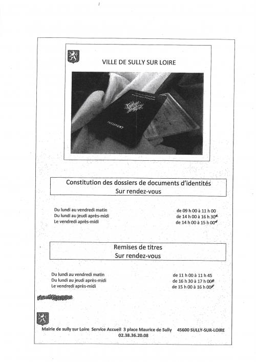 | Passeport | Création ou renouvellement : mairie de Sully 02 38 36 20 08 sur rdv Timbre fiscal de 86€ , 2 photos d’identité, pièce d’identité, justificatif de domicile de moins de 3 mois. |